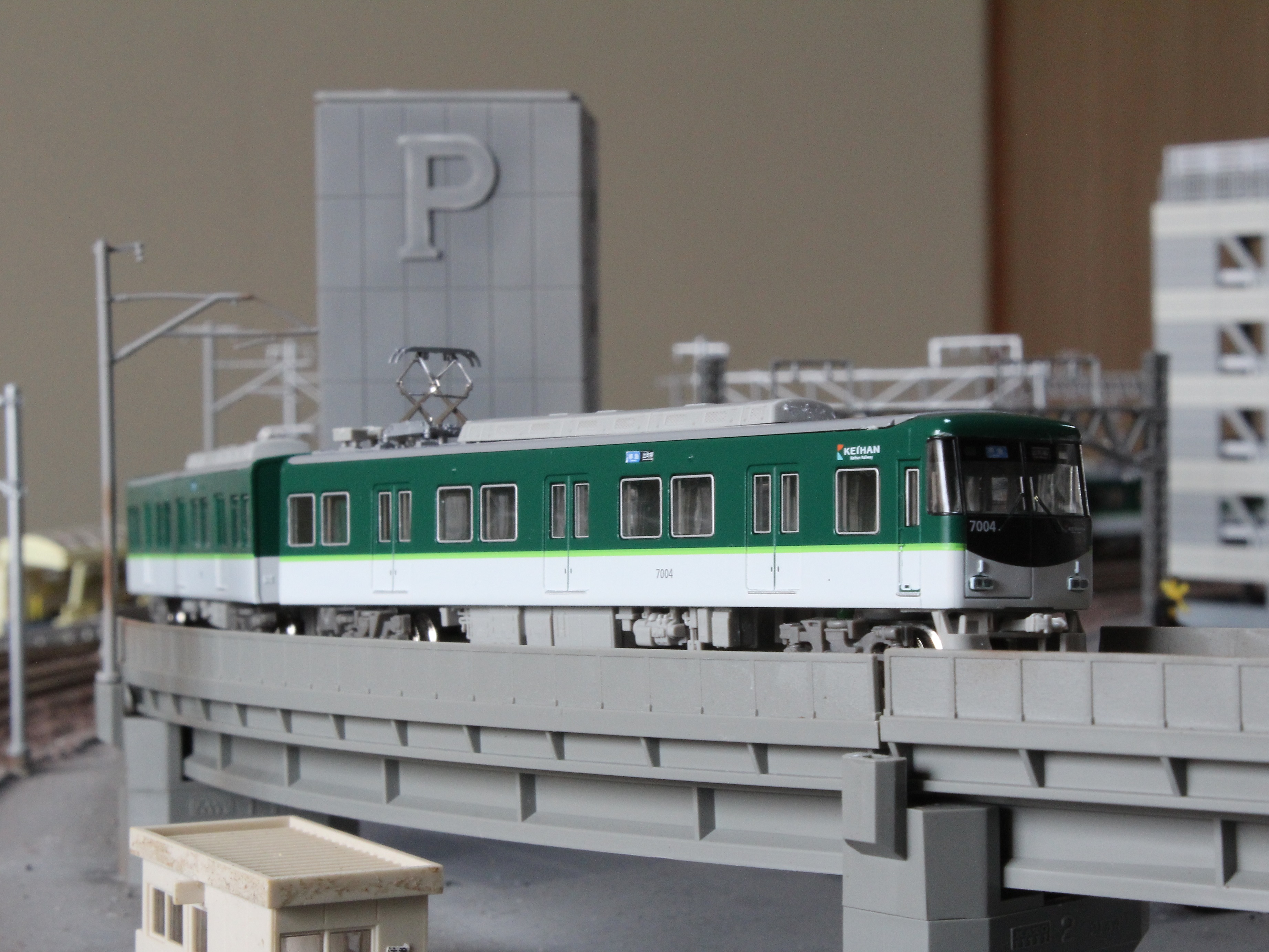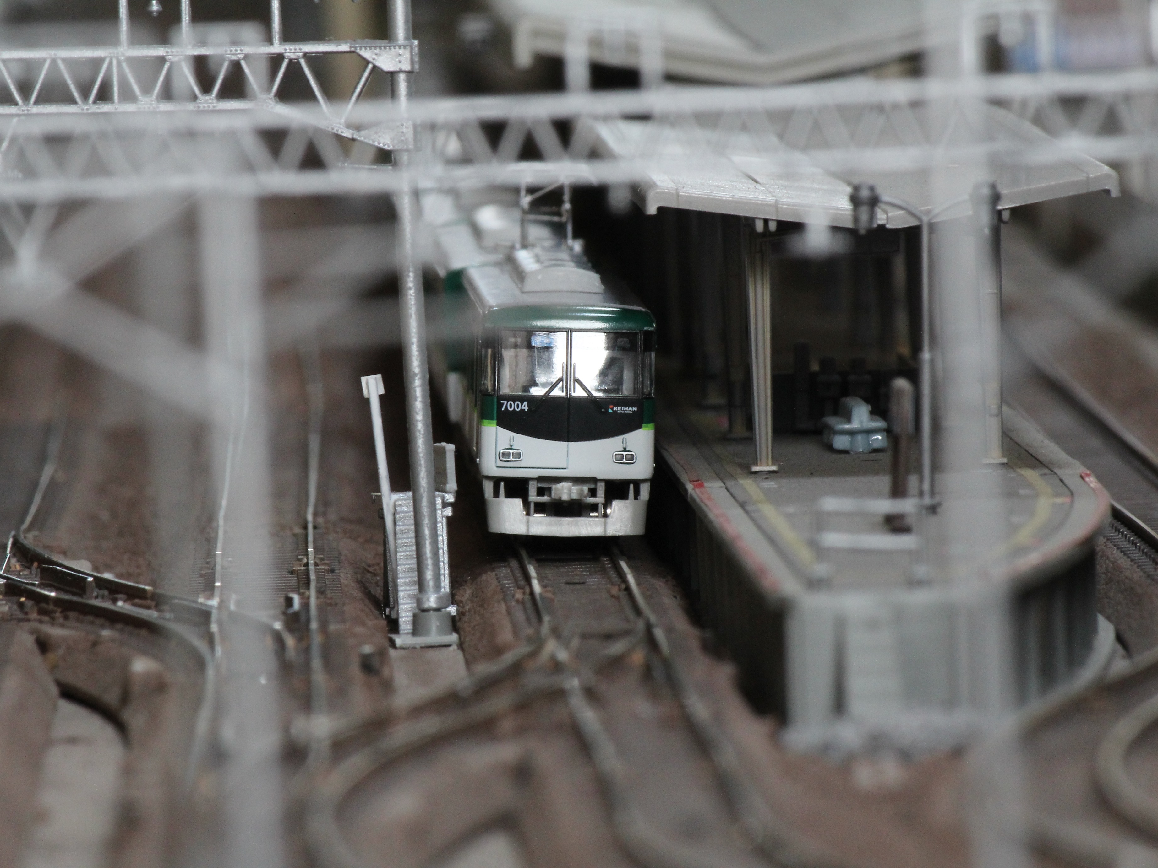 ホームに停車中の7004F。手前の架線柱がボケまくっていい感じにリアルです。