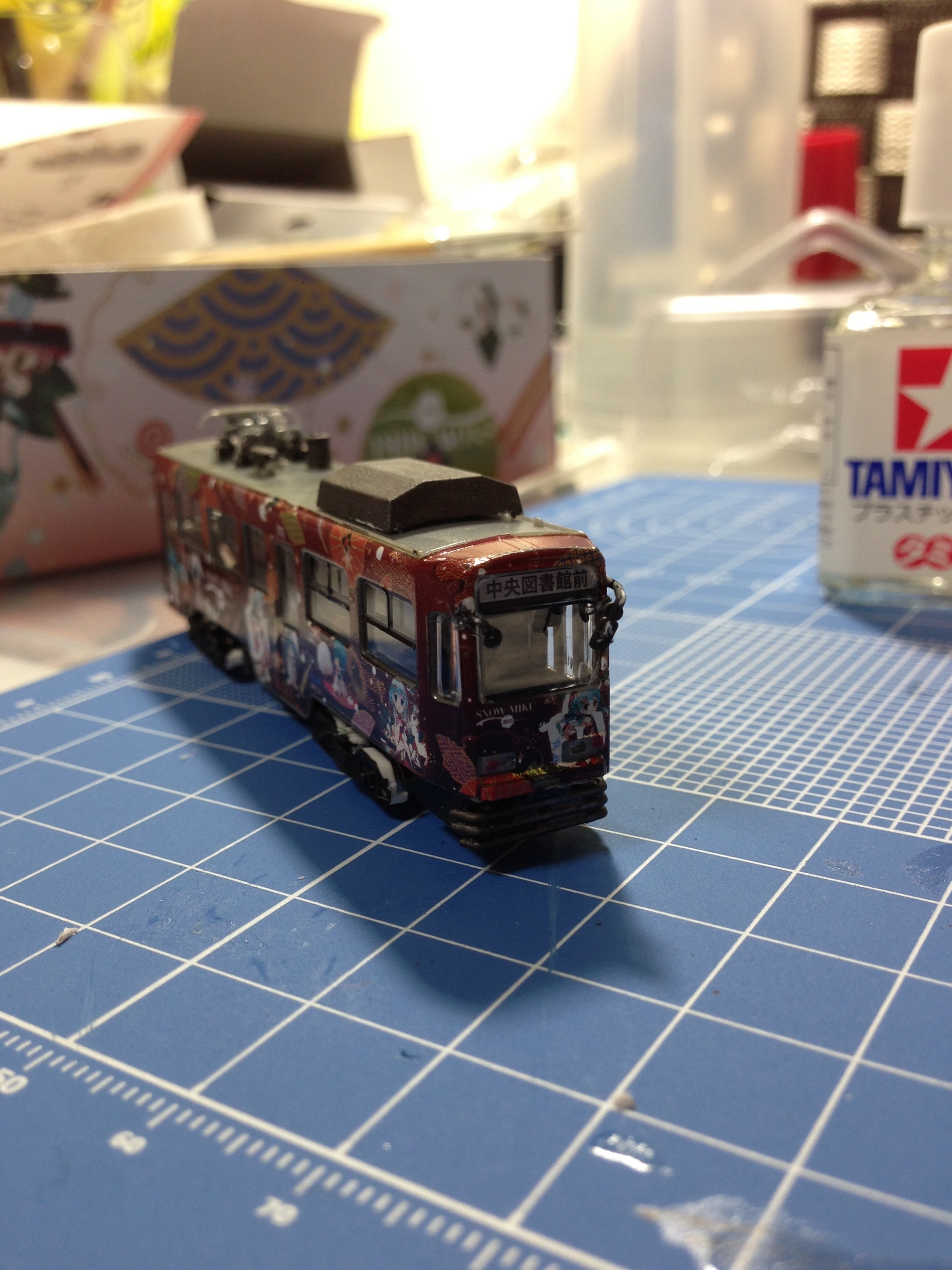 こちらはフジミ製の雪ミク市電の模型に鉄コレ動力「TM-TR01」を組み込んだ一品。