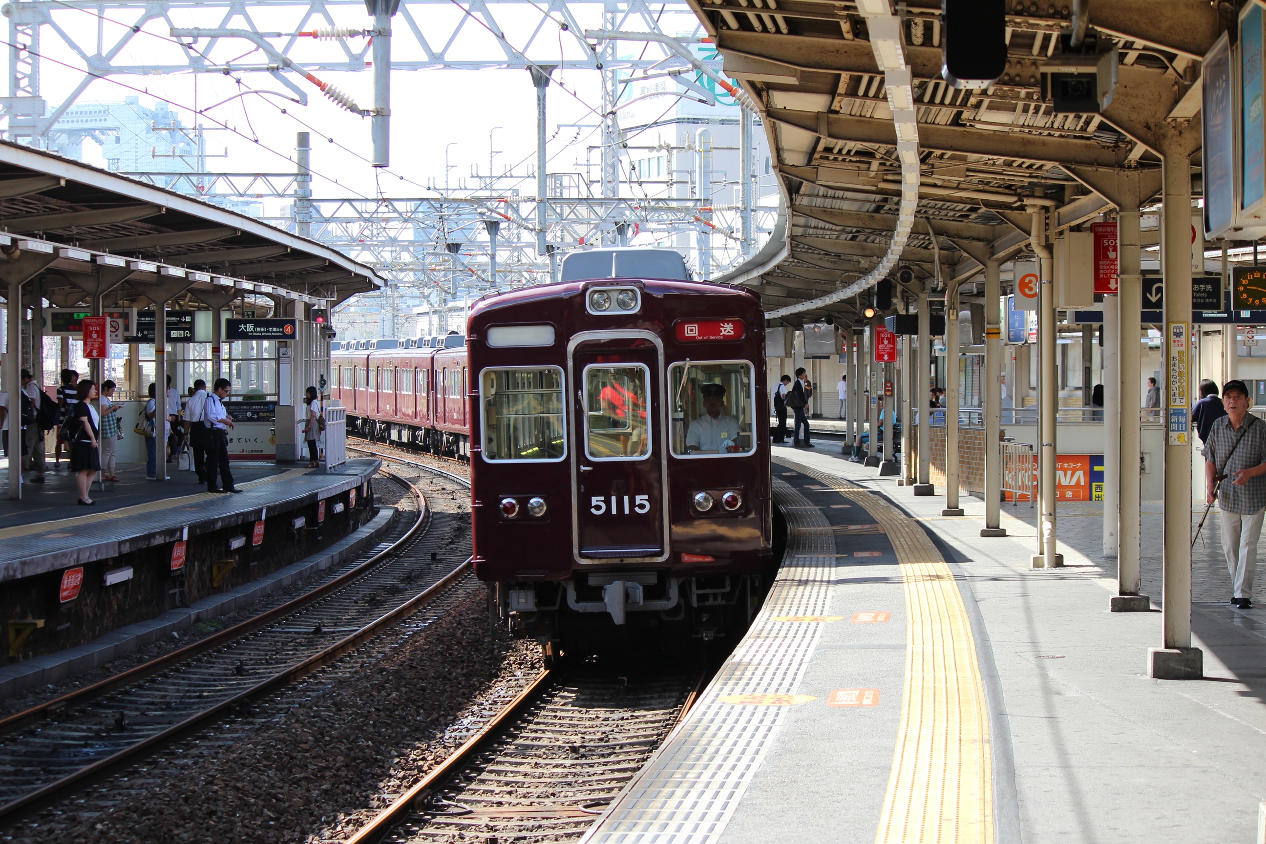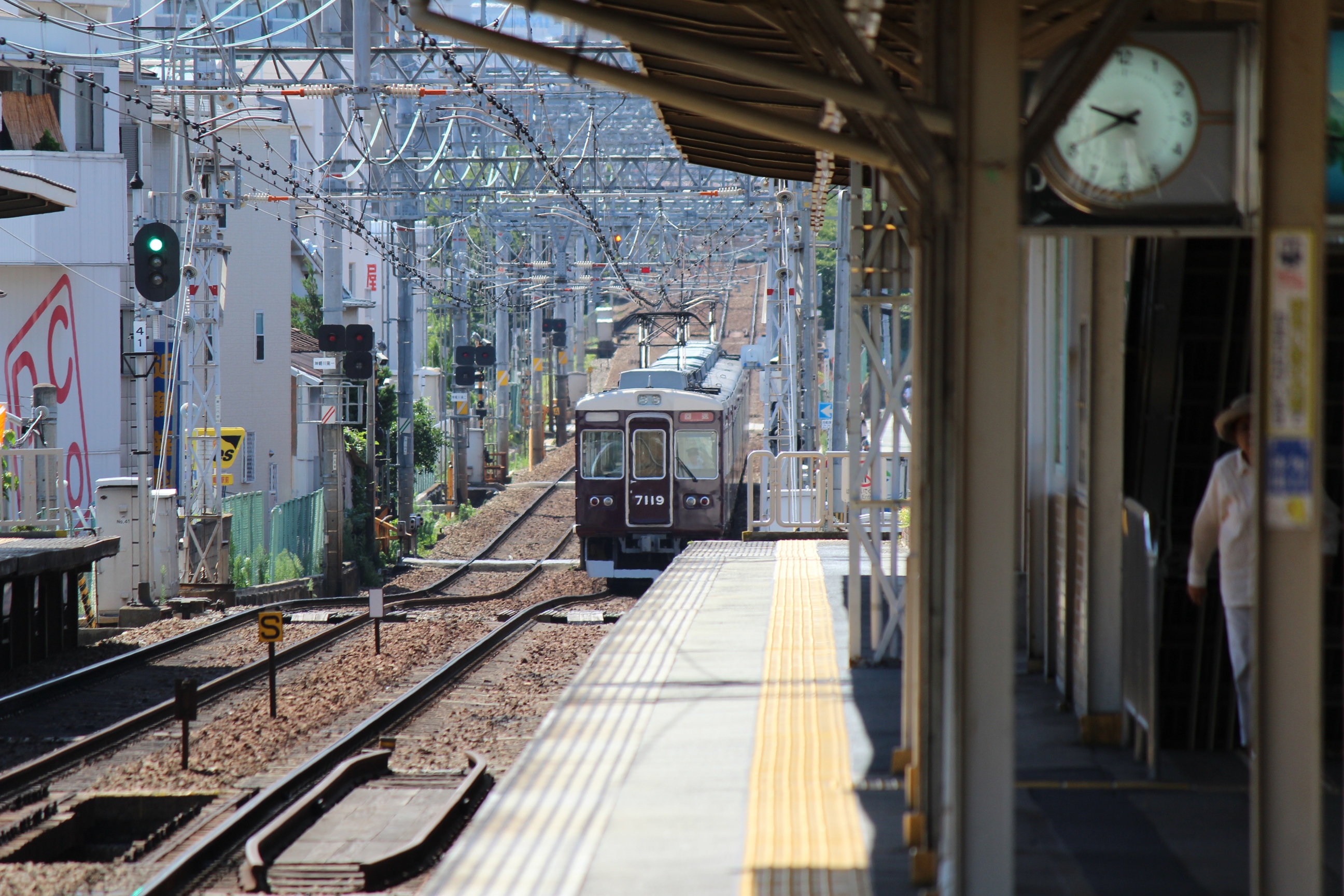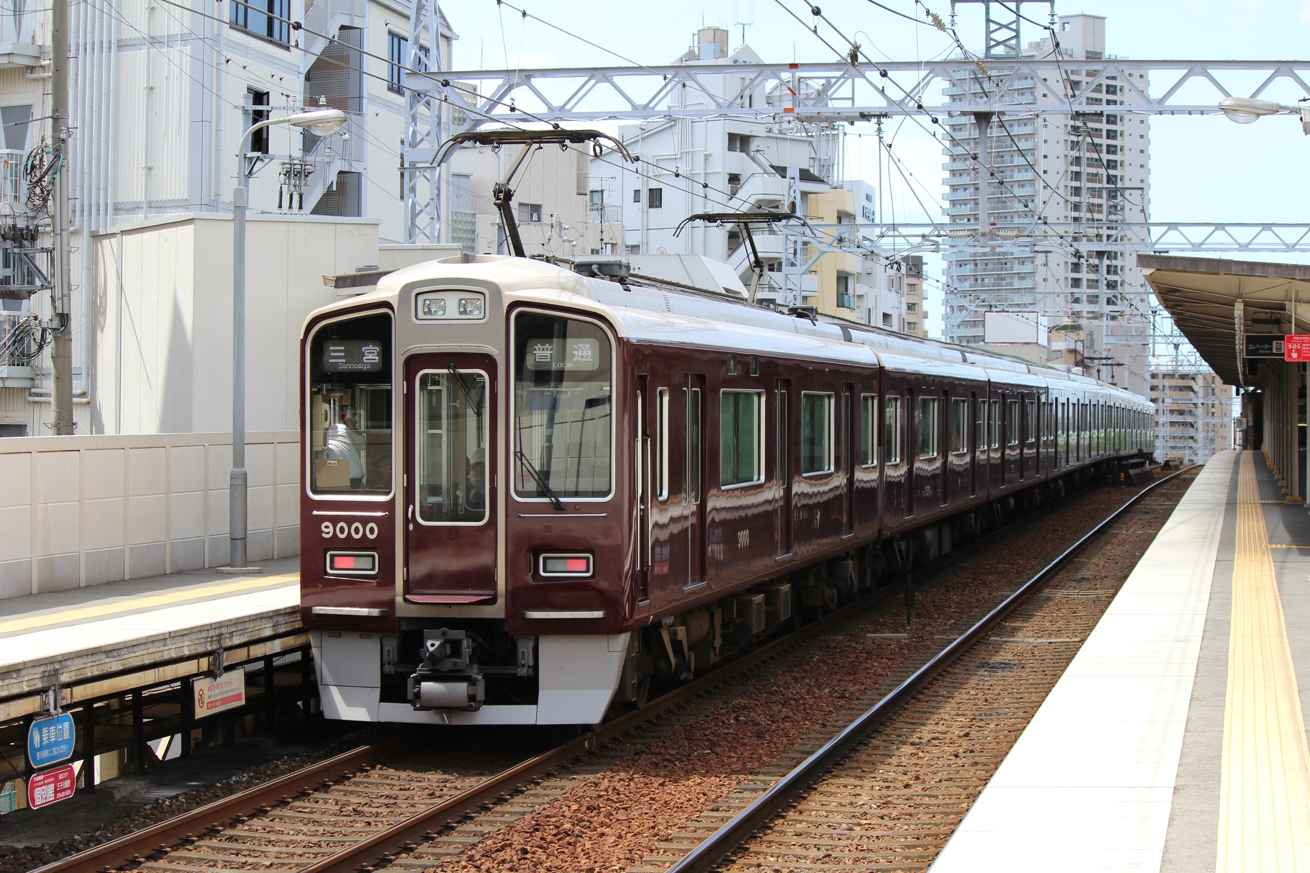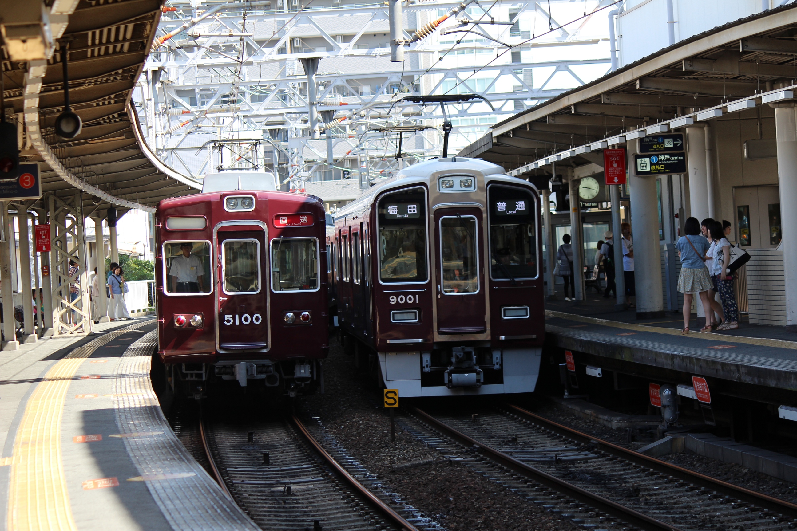 しかし暑いですねー。神崎川は三宮方面ホーム端に日陰があるのでいいんですけど…。